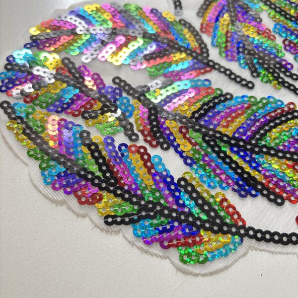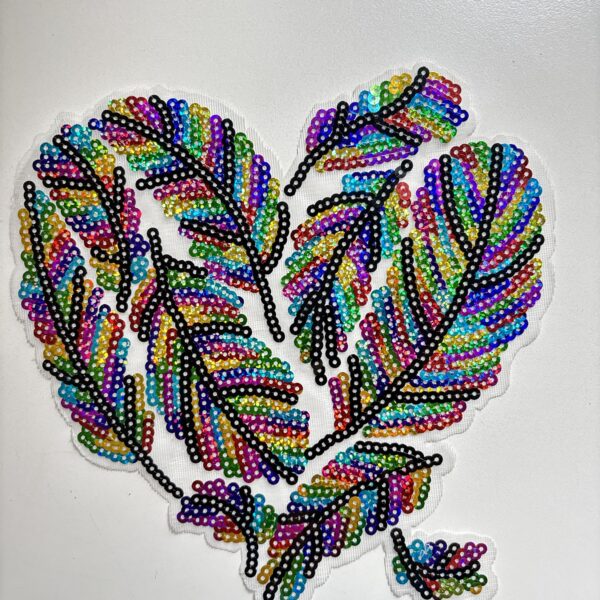 Plumas formando un corazón, lentejuelas de colores, se puede pegar con el calor de la plancha.