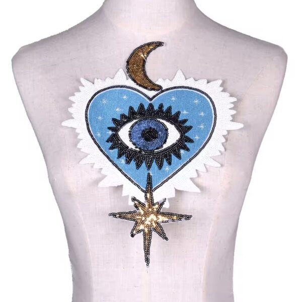 Divino aplique con forma de corazón celeste con borde blanco, luna y estrella doradas.