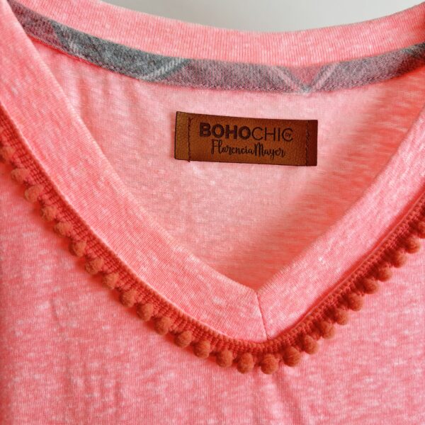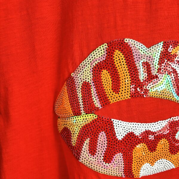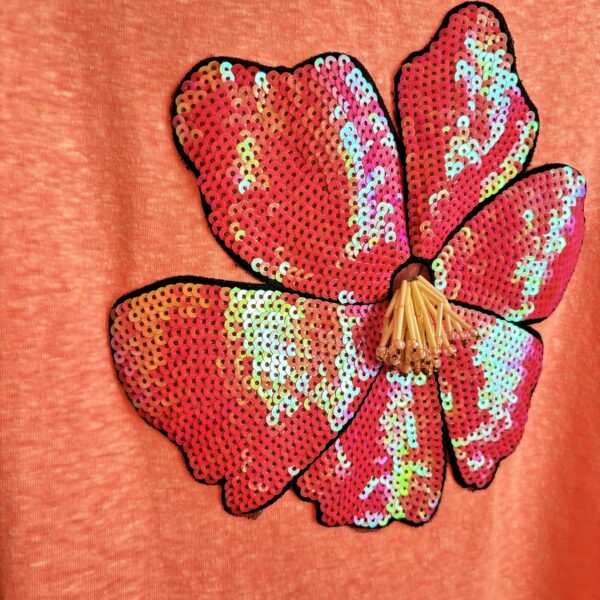 Remera de algodón color salmón y aplique de lentejuelas. Medidas 88 cm de contorno y 60 cm de largo.