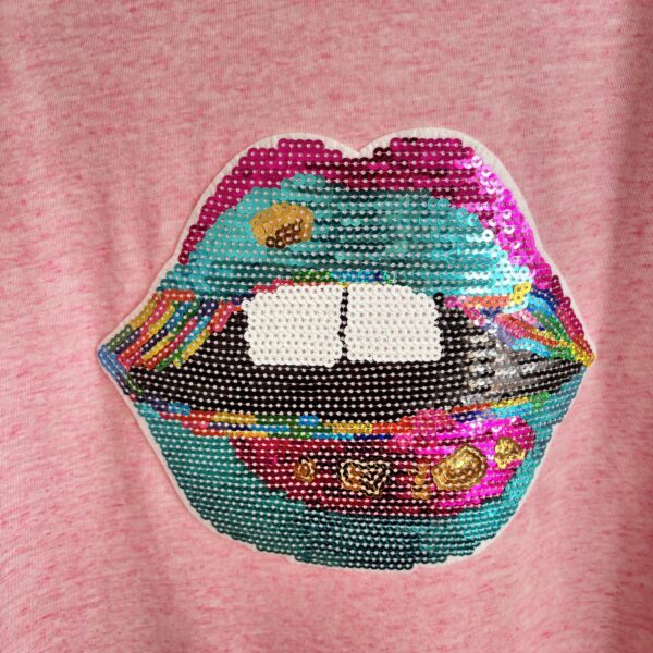 Remera color rosa con aplique de lentejuelas. Medidas 90 cm de contorno y 64 cm de largo.