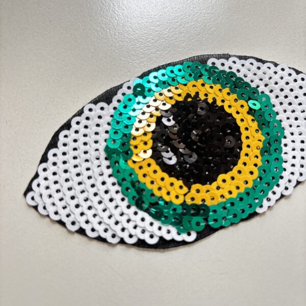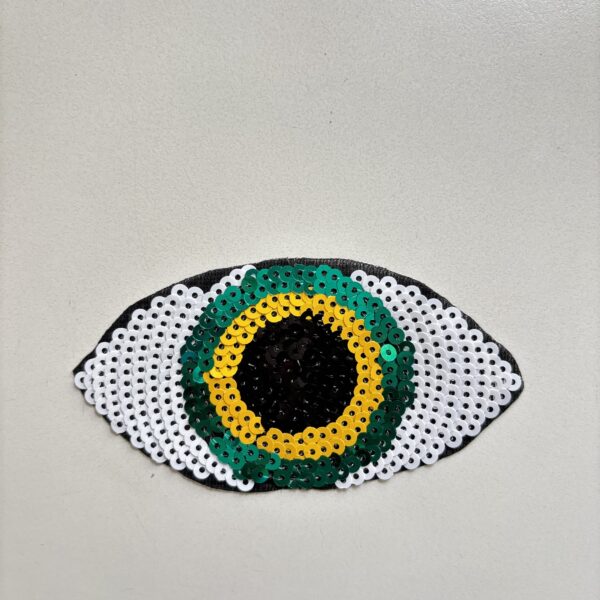 Ojito con lentejuelas blancas, verdes y amarillas.