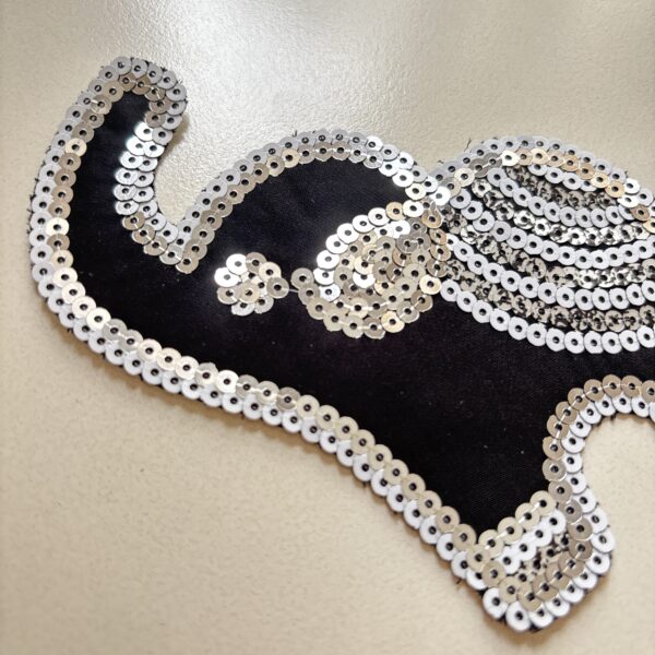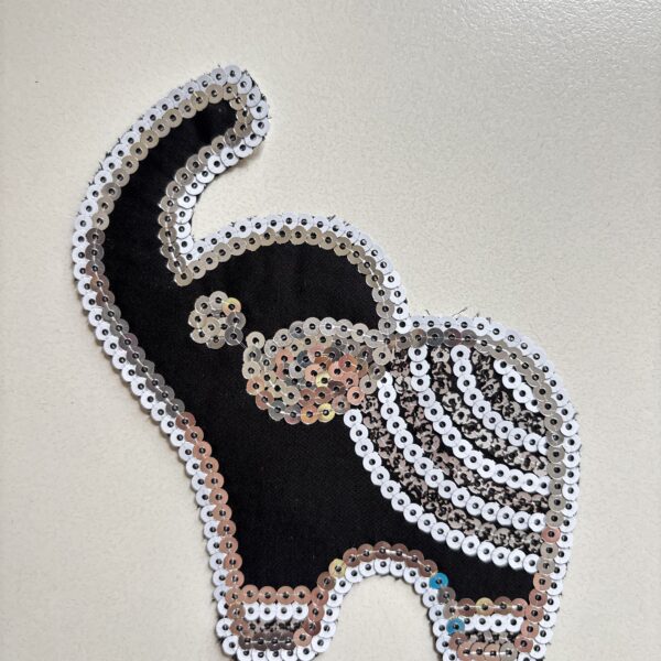 Elefante negro con lentejuelas plateadas y blancas, se pega con el calor de la plancha.