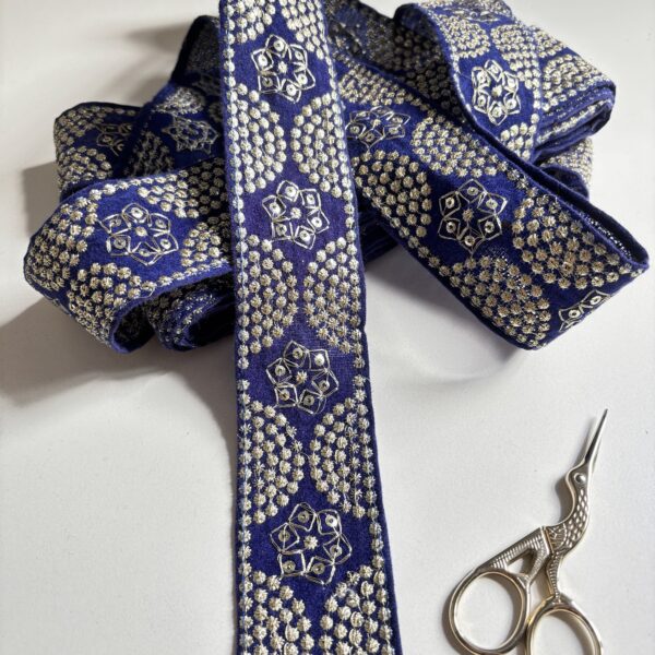 Galón ancho bordado en tela color violeta.