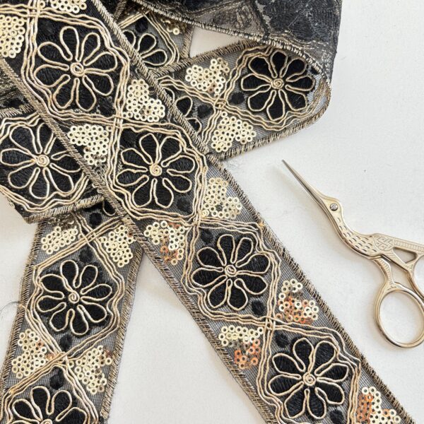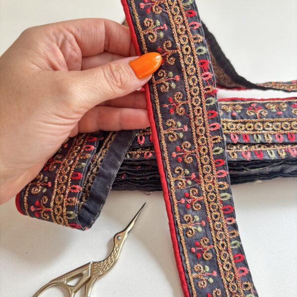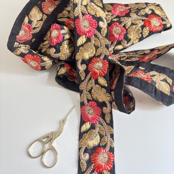 Galón con fondo negro, flores bordadas en hilo rosa, rojo y dorado 🤩