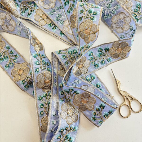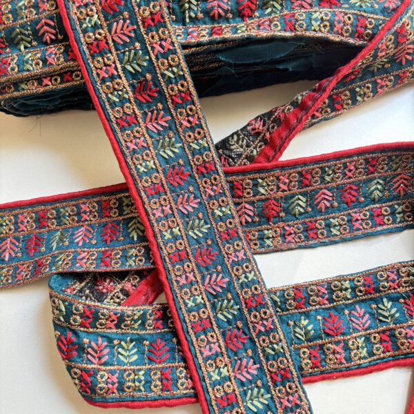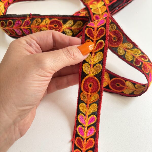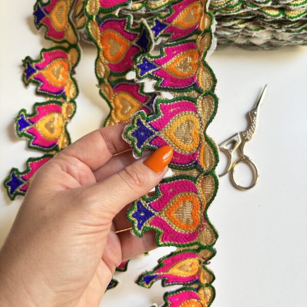 Galón bordado con hilos dorados, fucsias, celestes y amarillos, también tiene unos espejitos divinos que le dan el toque Boho 🌟