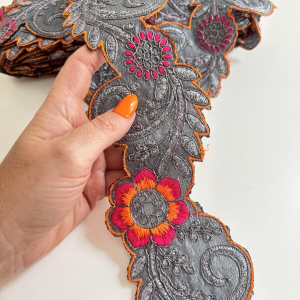 Estilo hindú bordado con hilos de colores, naranja, bordeau, verde y fucsia.