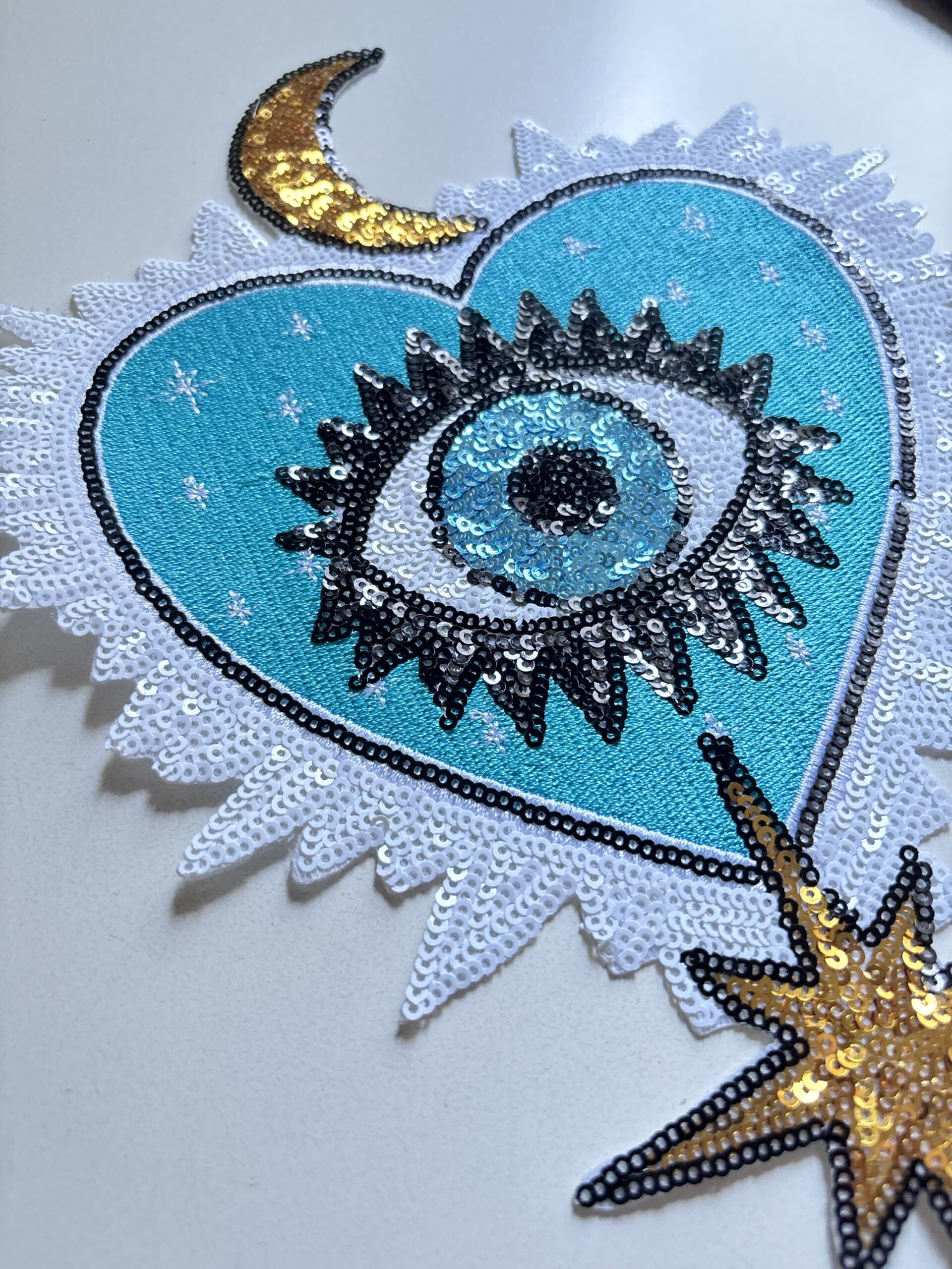Divino aplique con forma de corazón celeste con borde blanco, luna y estrella doradas.