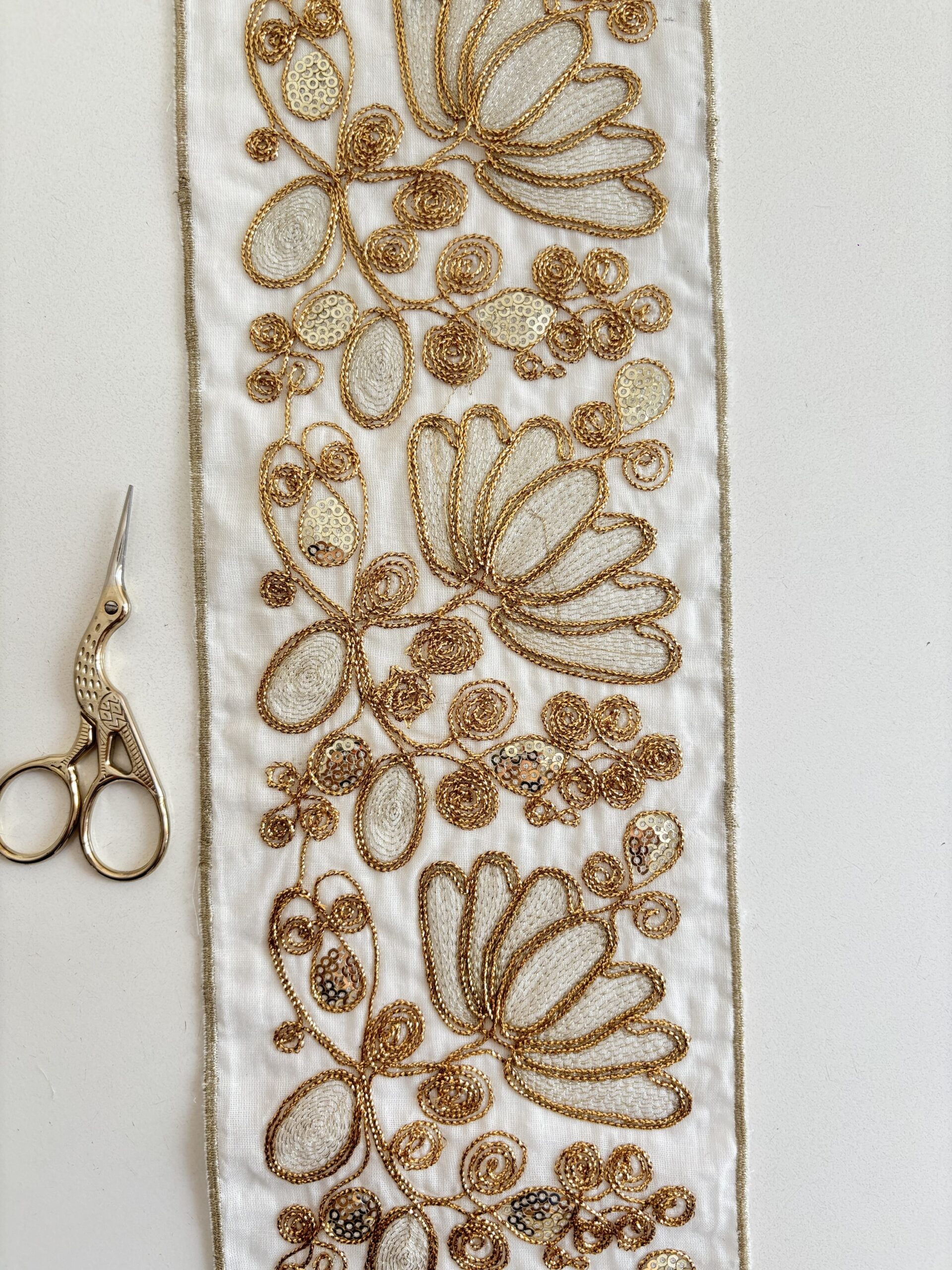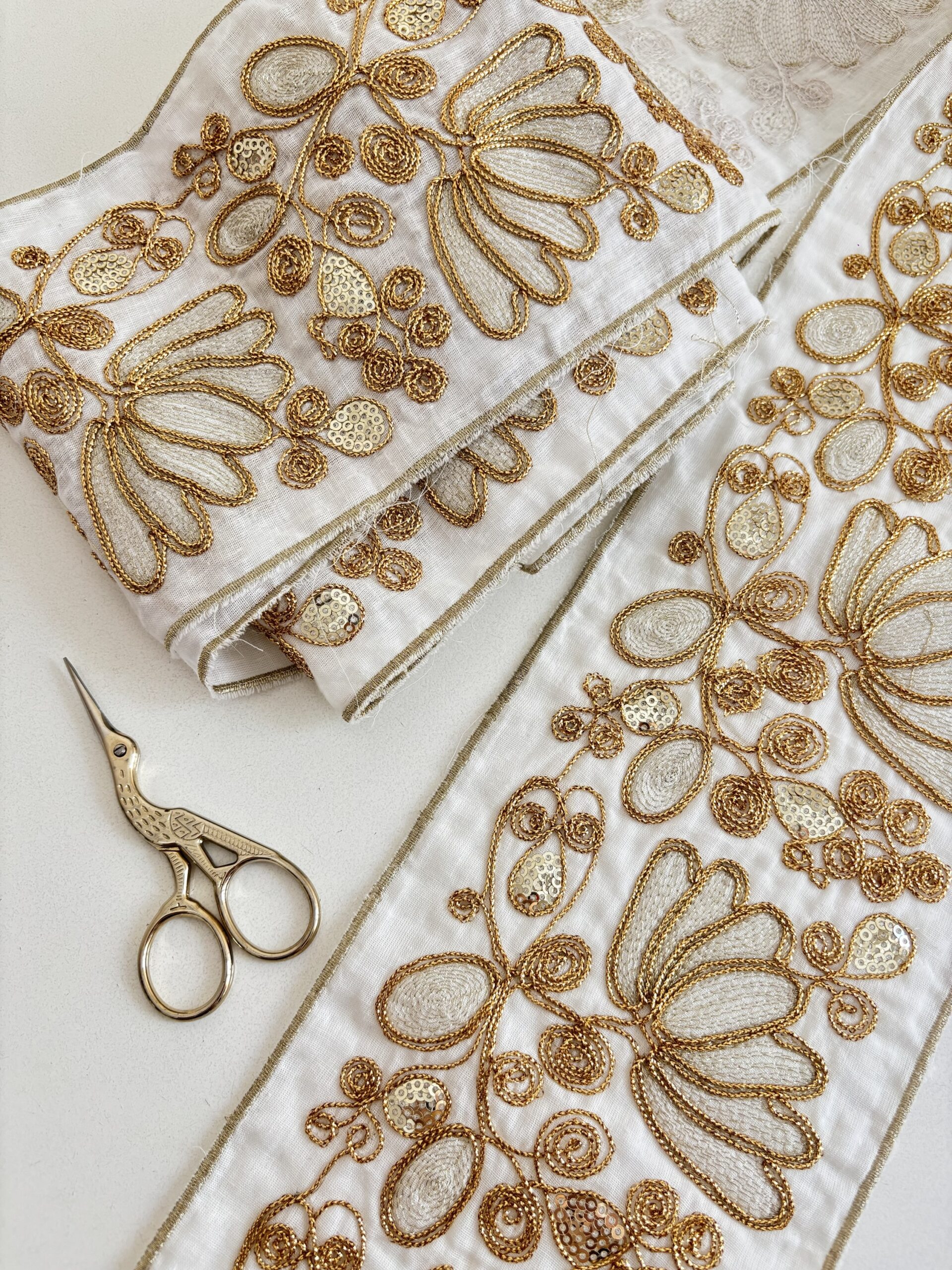 Bordado con hilos dorados en tela blanca.