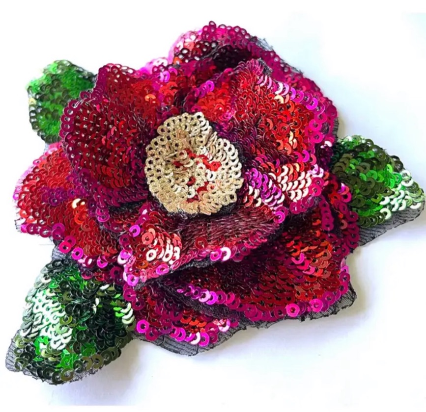 • Flor con volumen, bordada en lentejuelas con centro dorado.