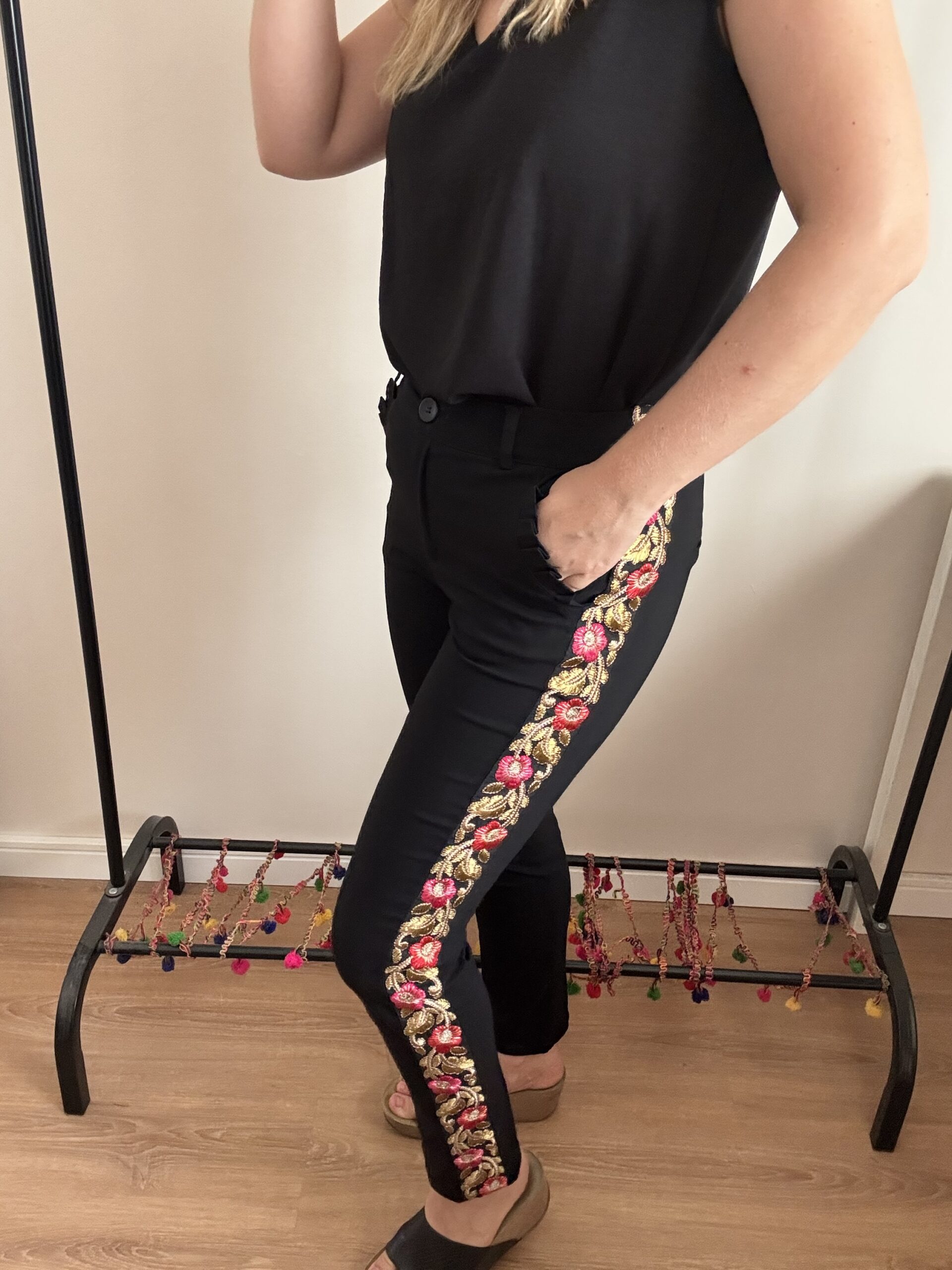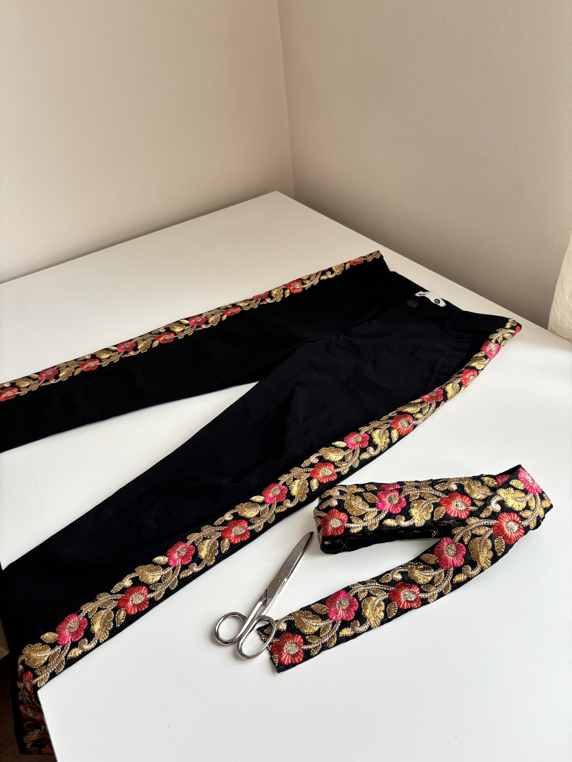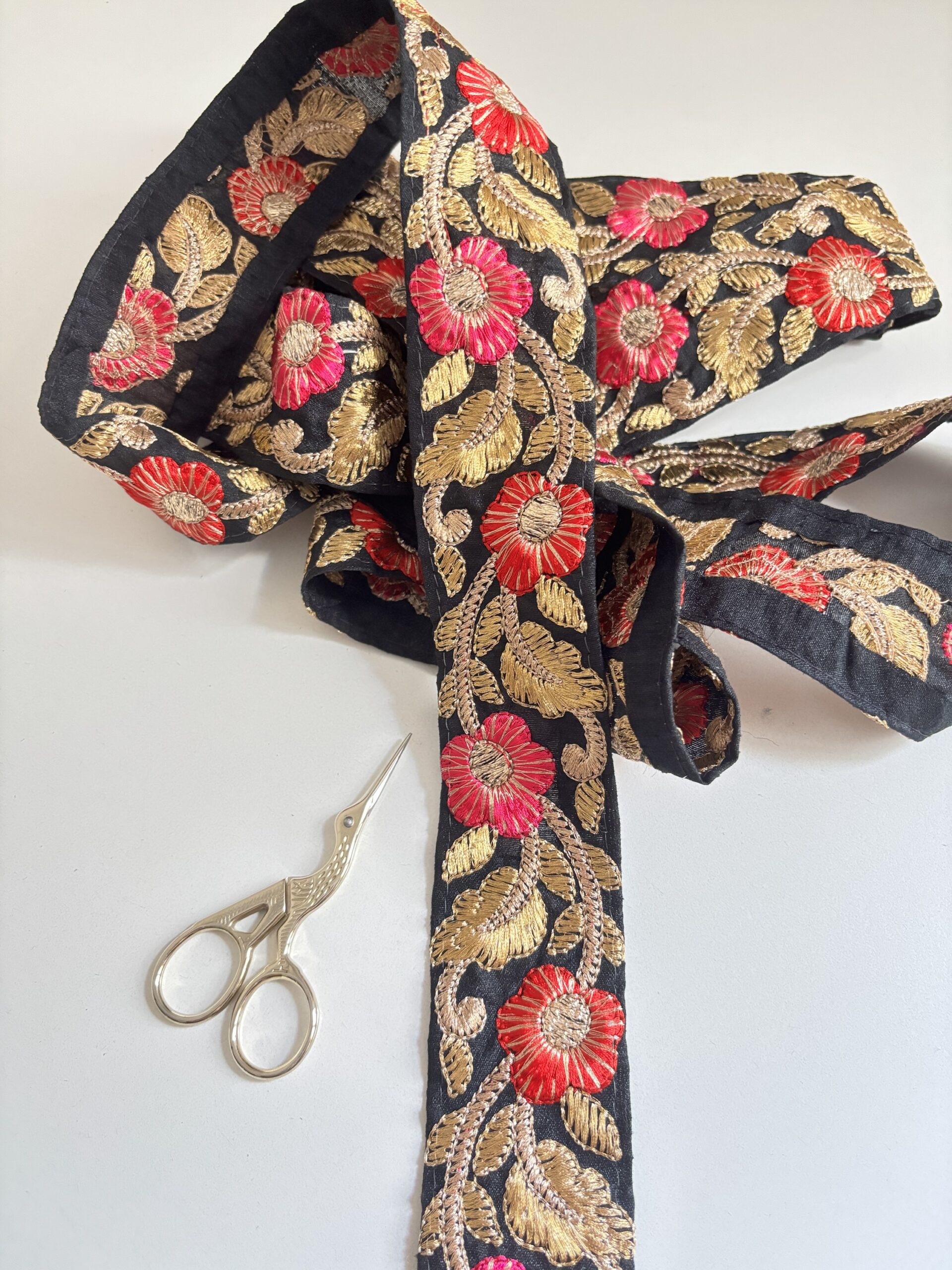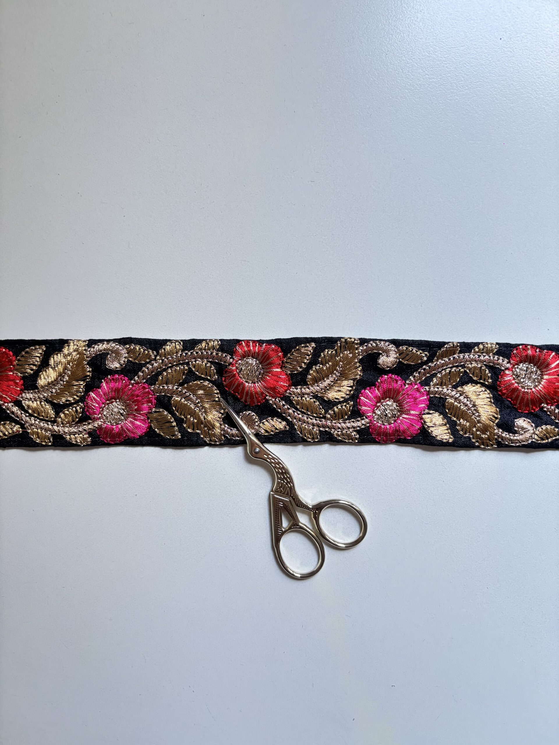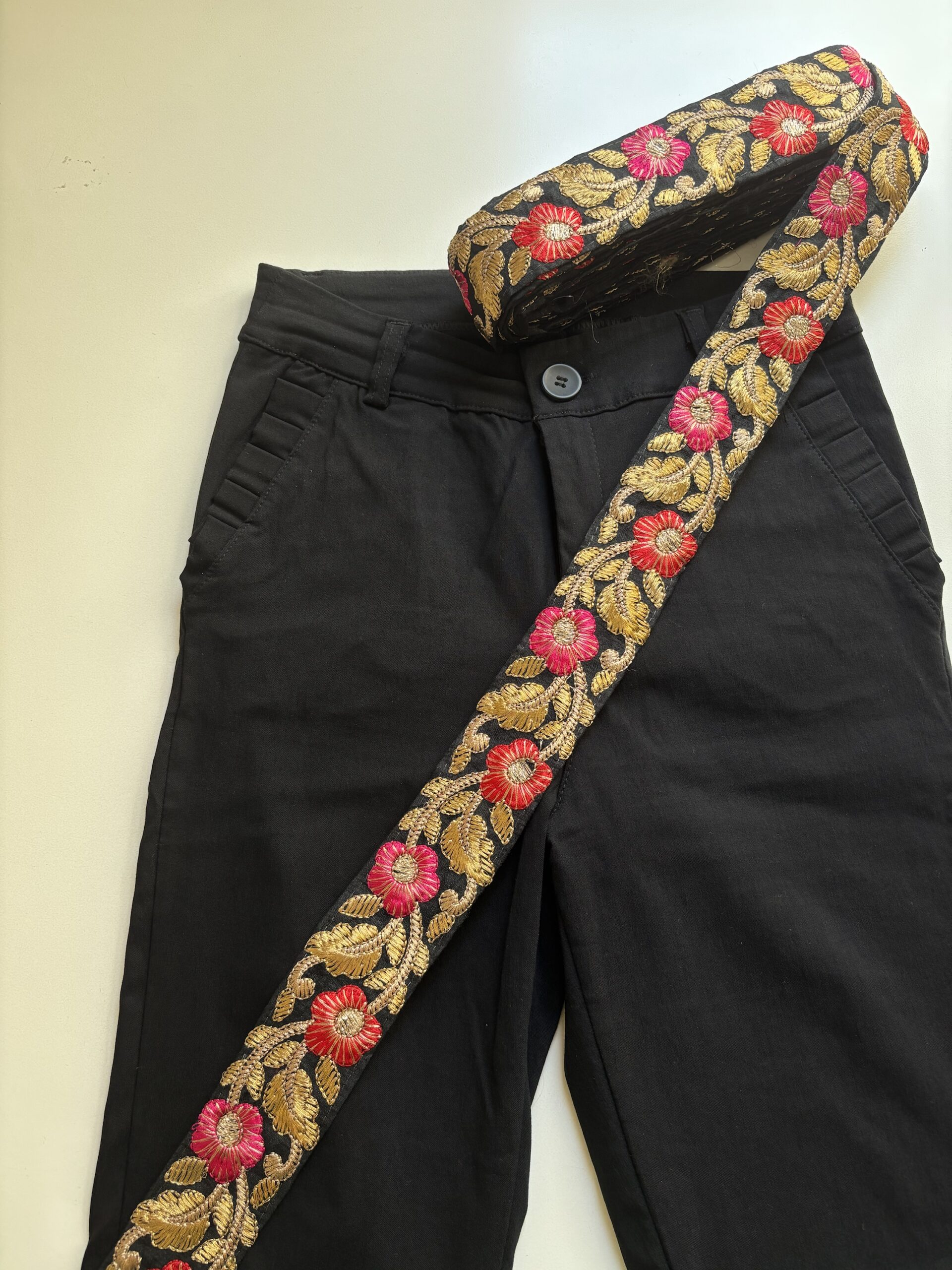 Galón con fondo negro, flores bordadas en hilo rosa, rojo y dorado 🤩