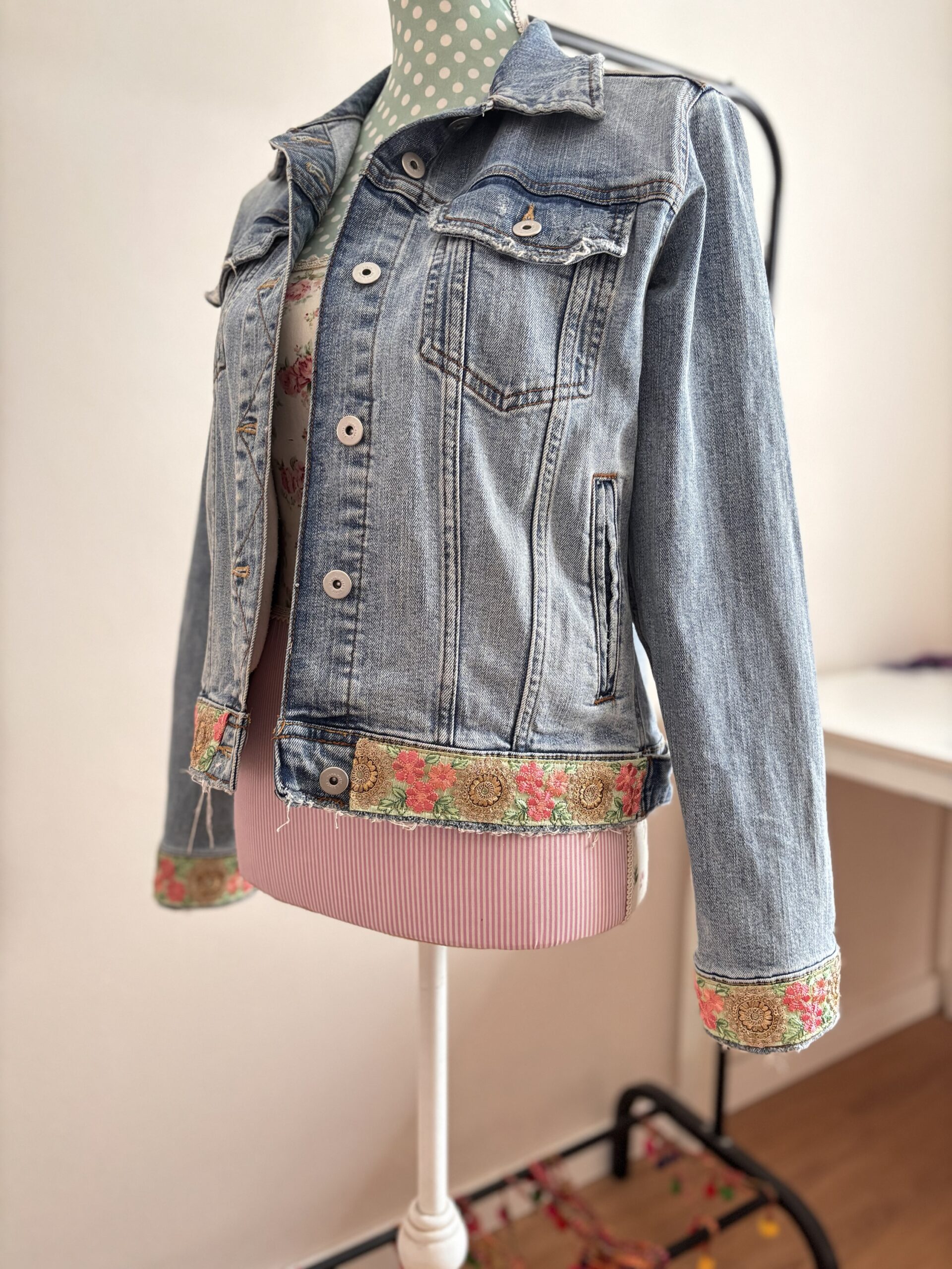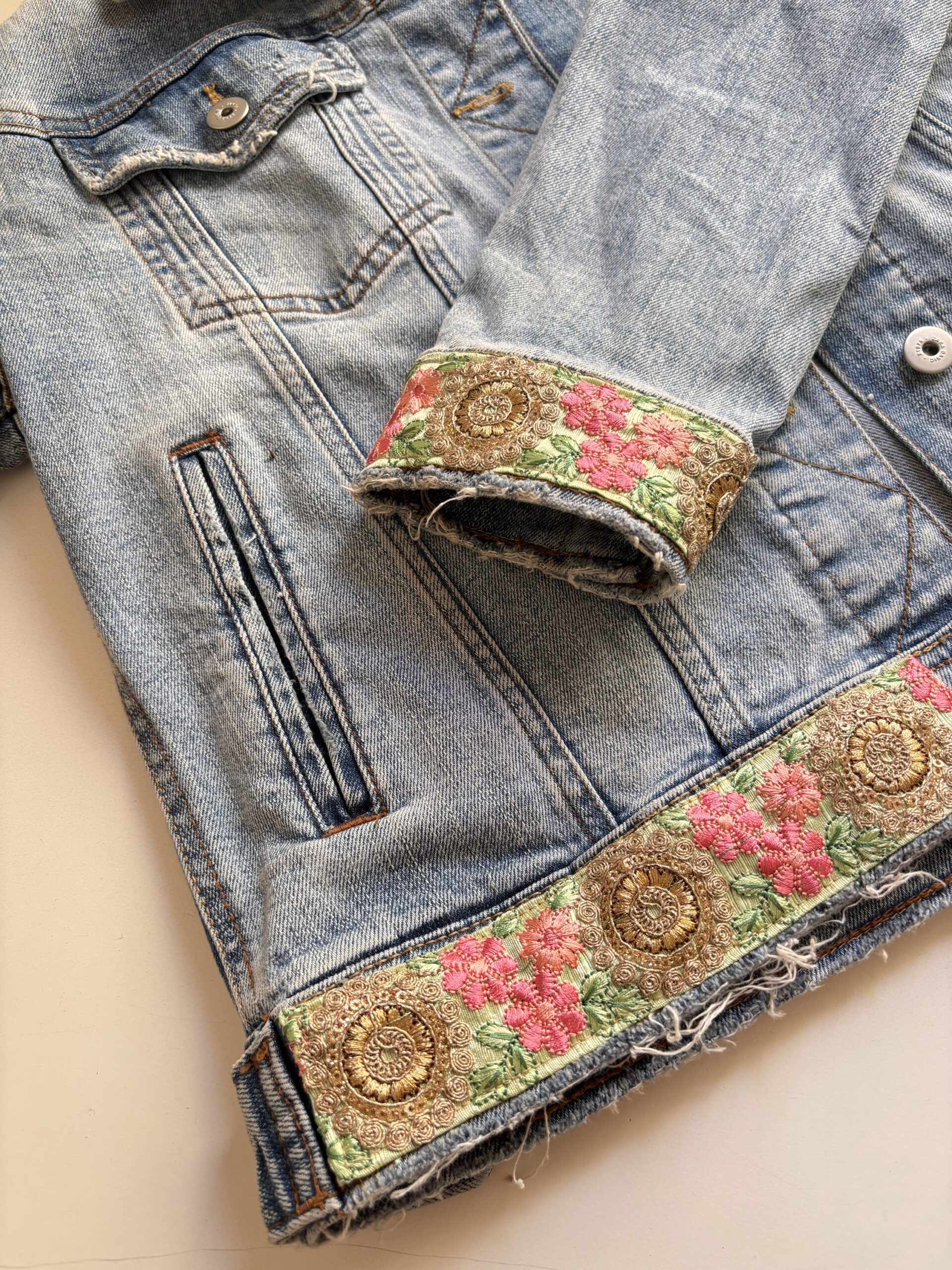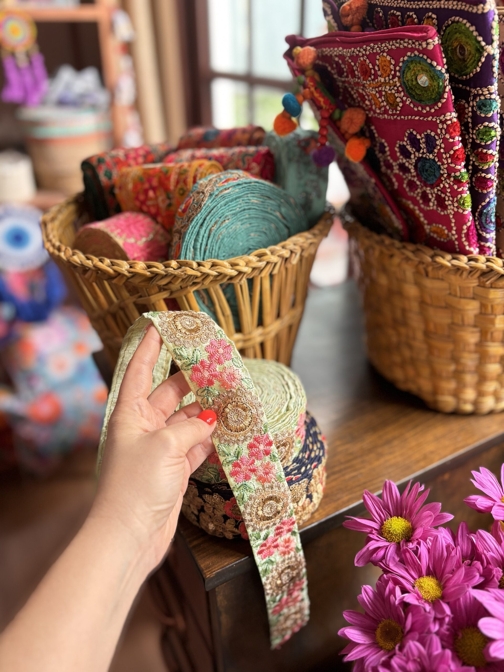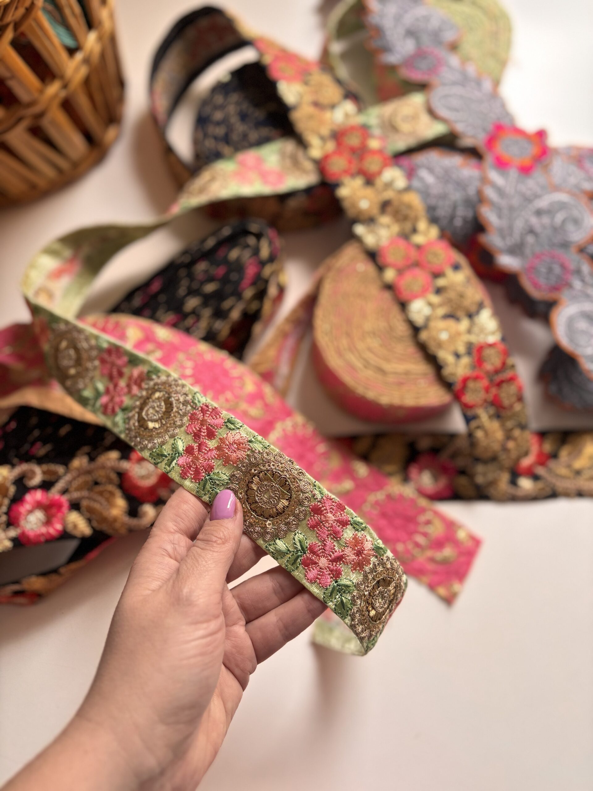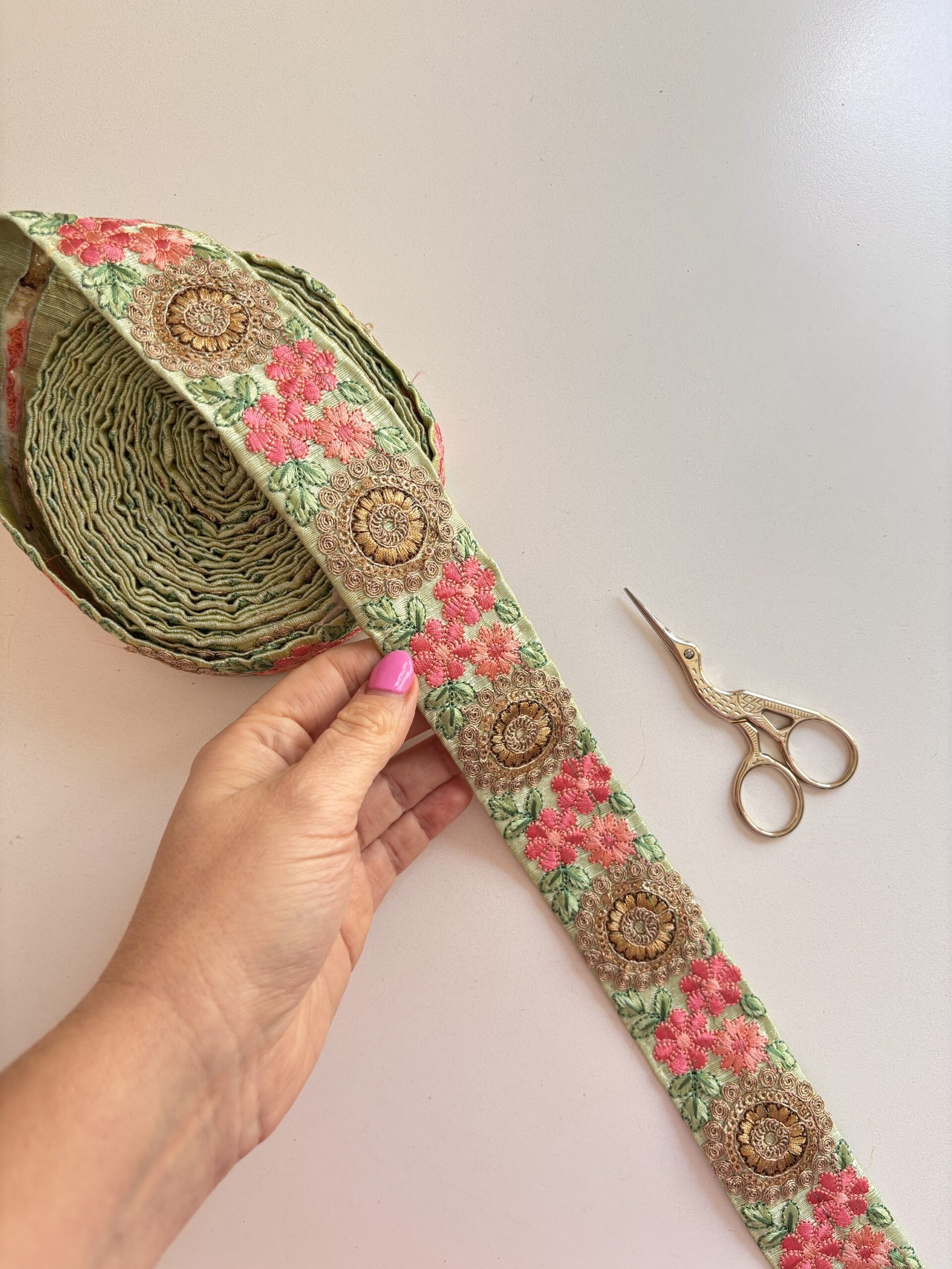 Galón bordado con diseño de flores rosas y doradas 🌸🌟