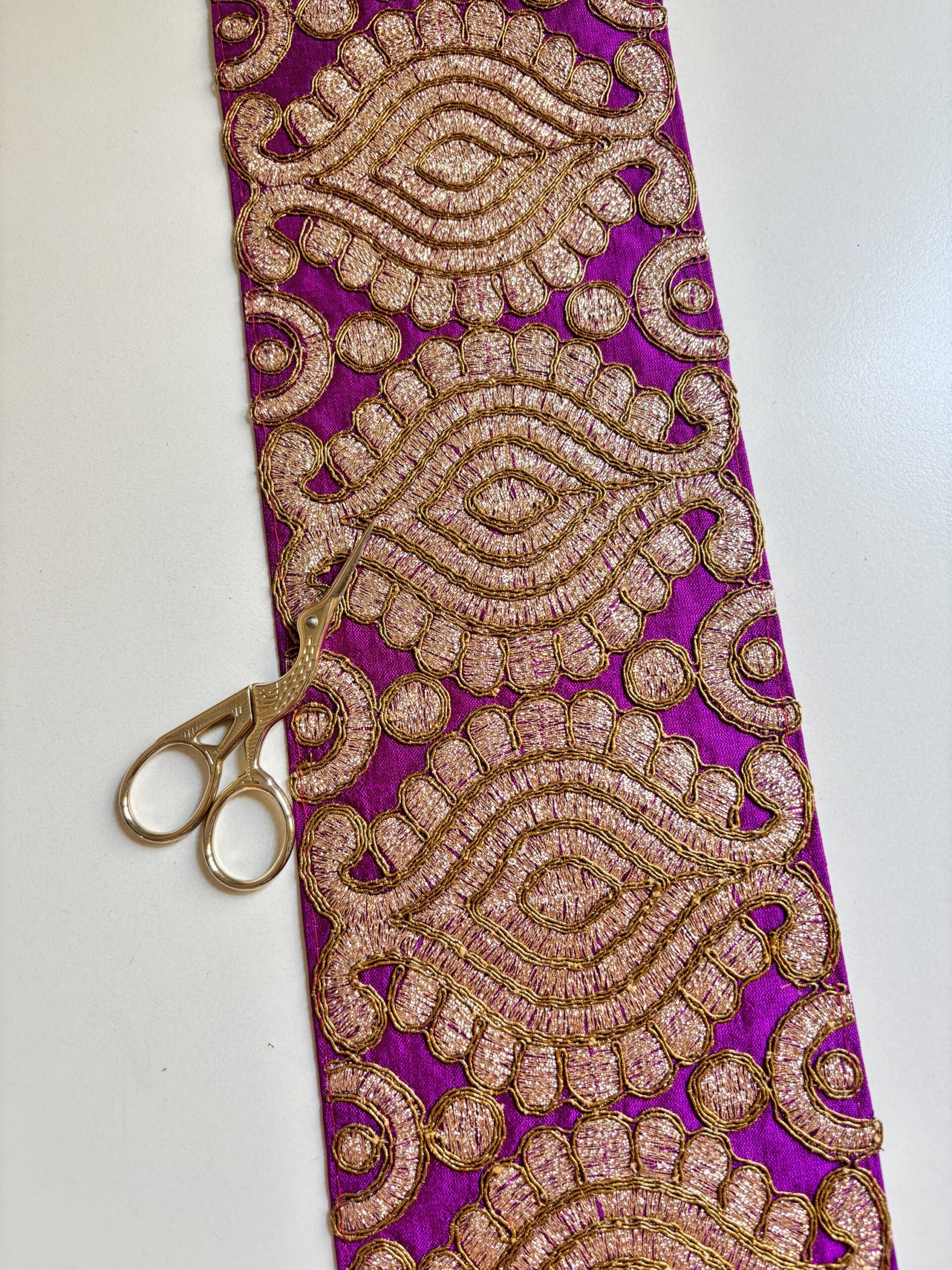 Galón ancho bordado en tela color violeta.