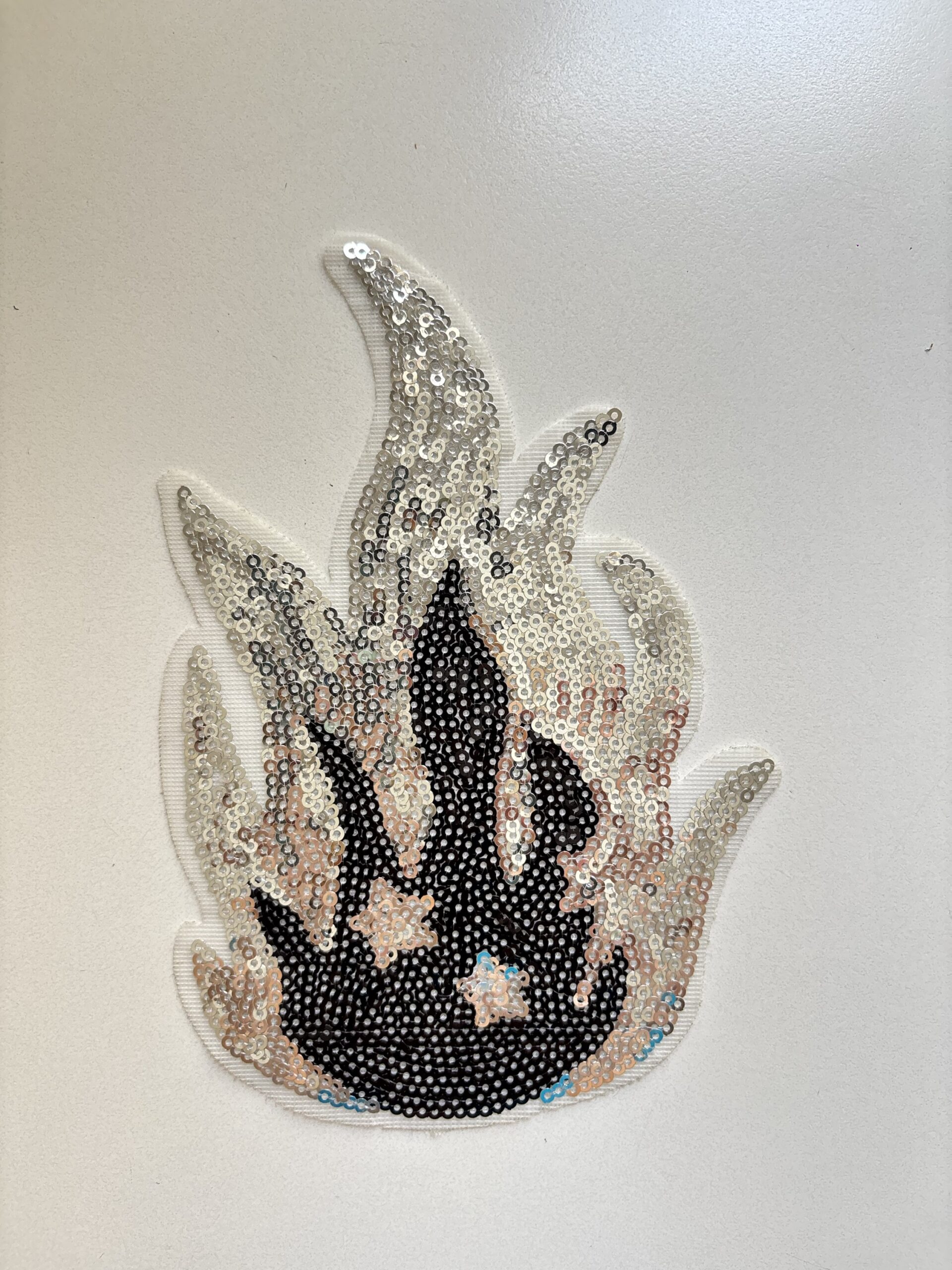 Aplique de lentejuelas plateadas y negras para pegar con el calor de la plancha.