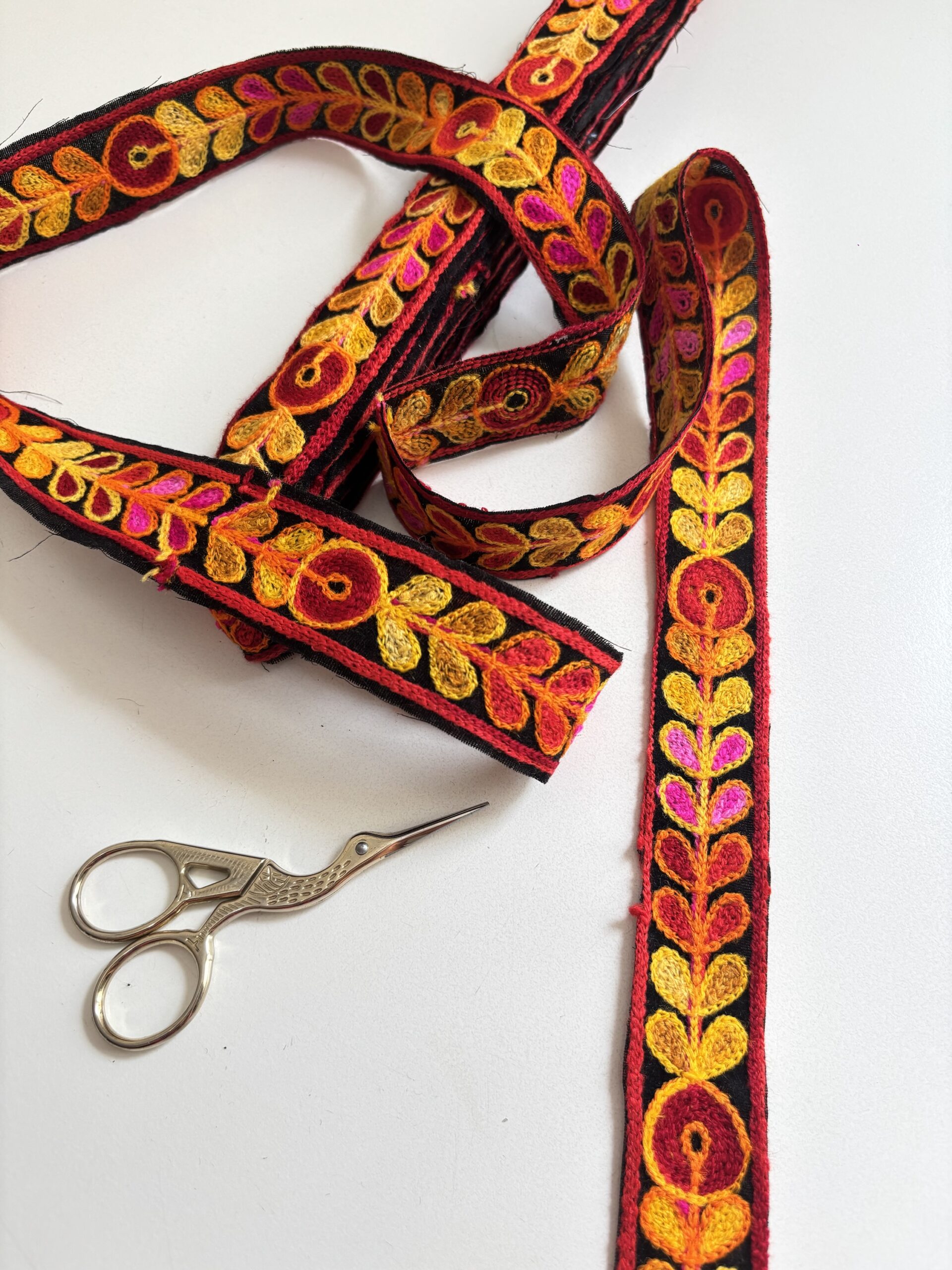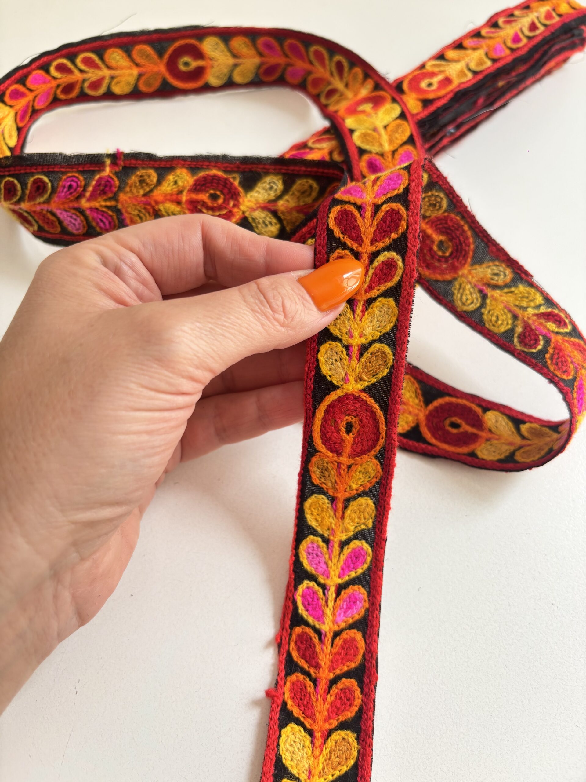 Fondo negro bordado con lanas color naranja, rojo, amarillo y rosa.