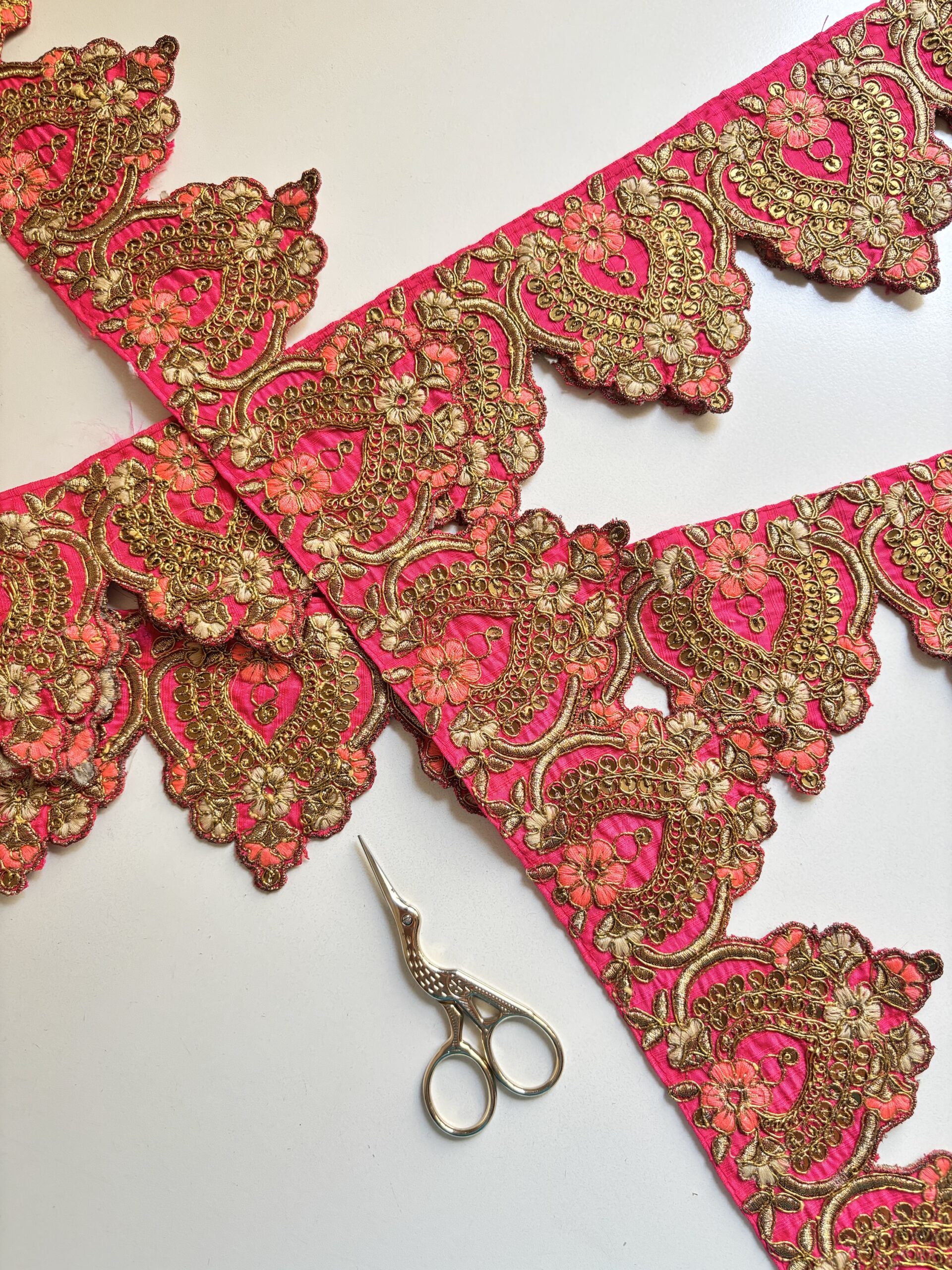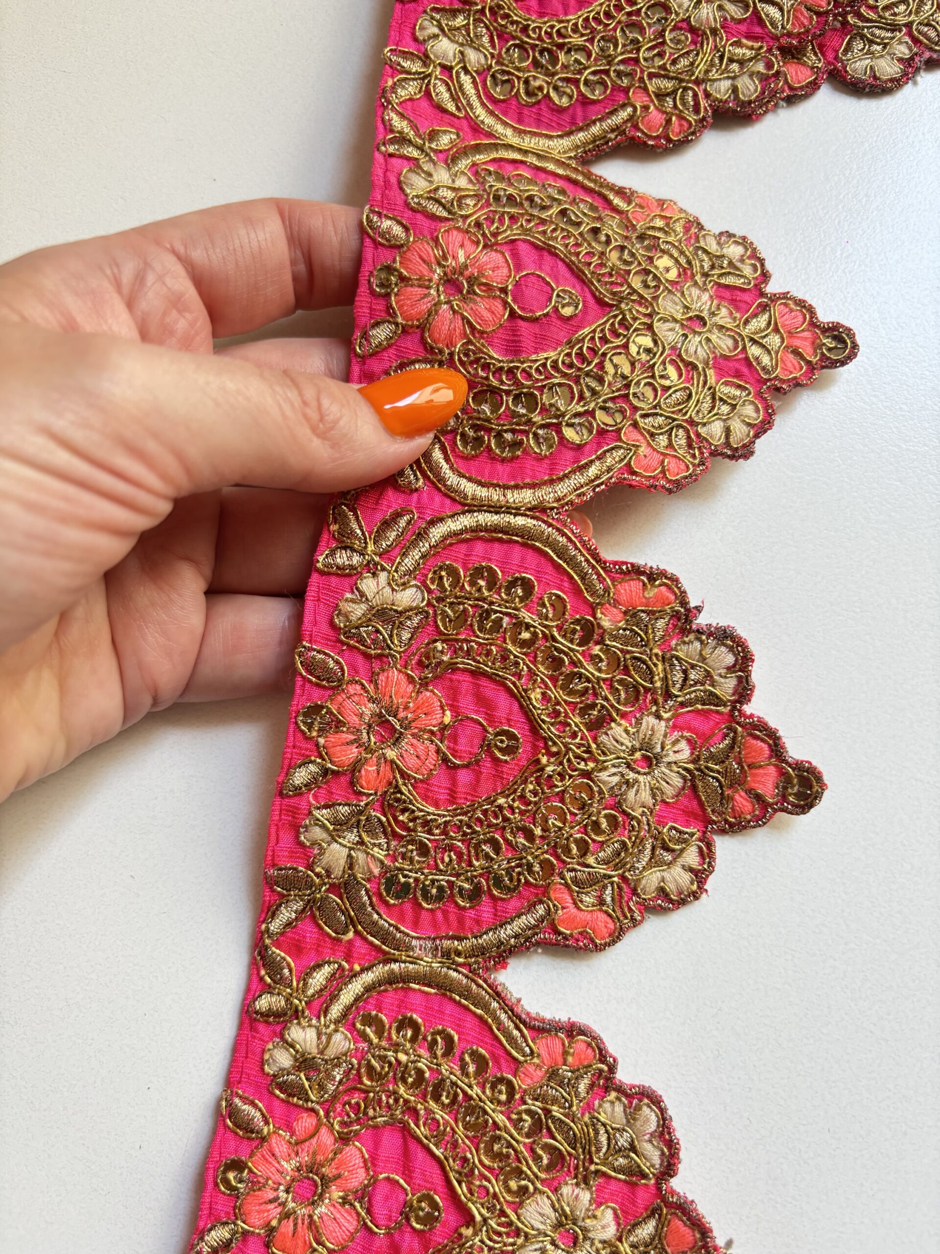 Color fucsia bordado con hilos y lentejuelas doradas.