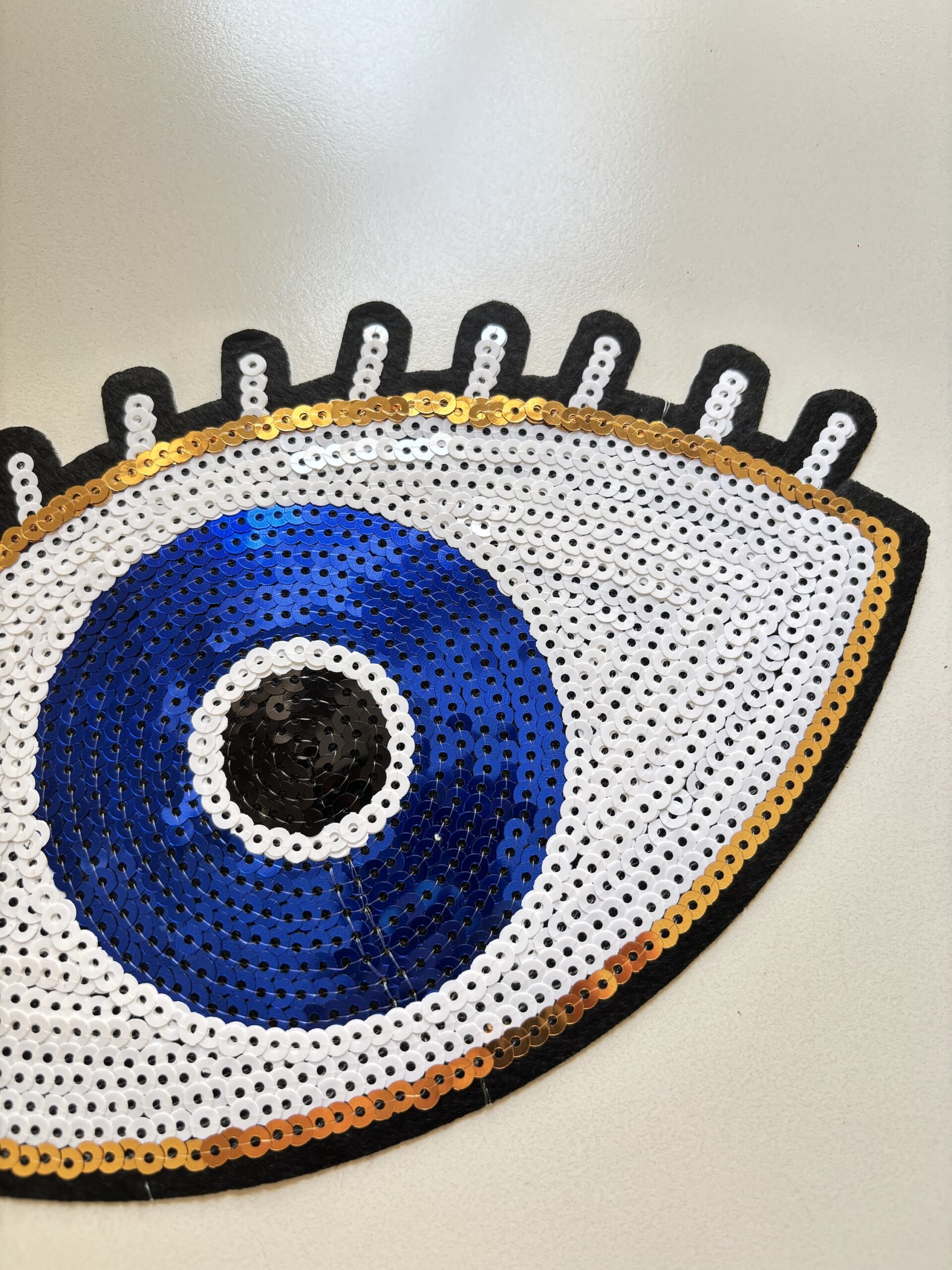 Ojo blanco con borde dorado y centro azul.