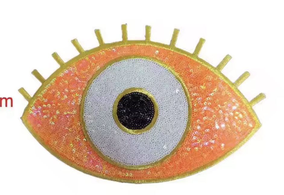 Ojo de lentejuelas, color naranja con borde dorado.