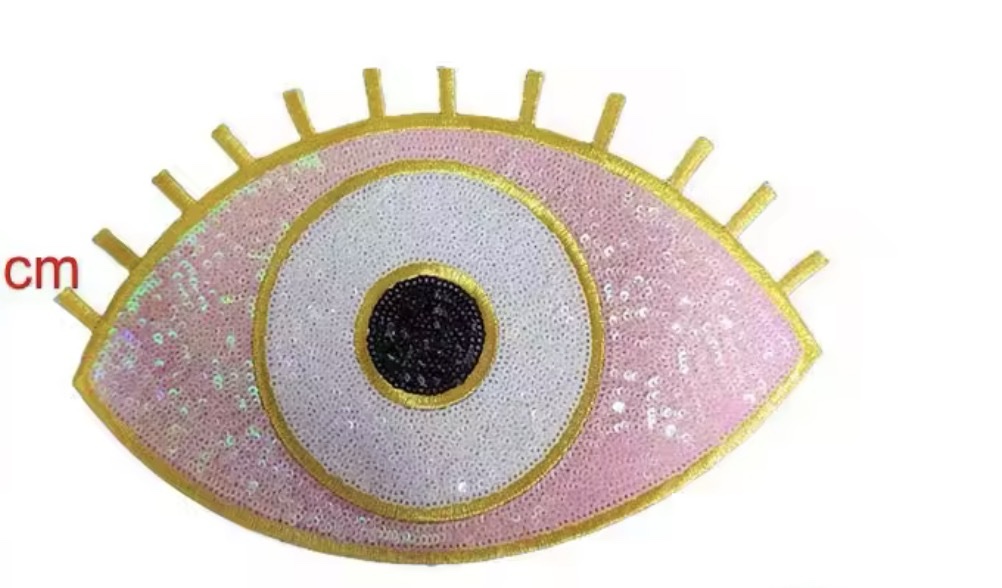 Ojo de lentejuelas, color rosa clarito y borde dorado.