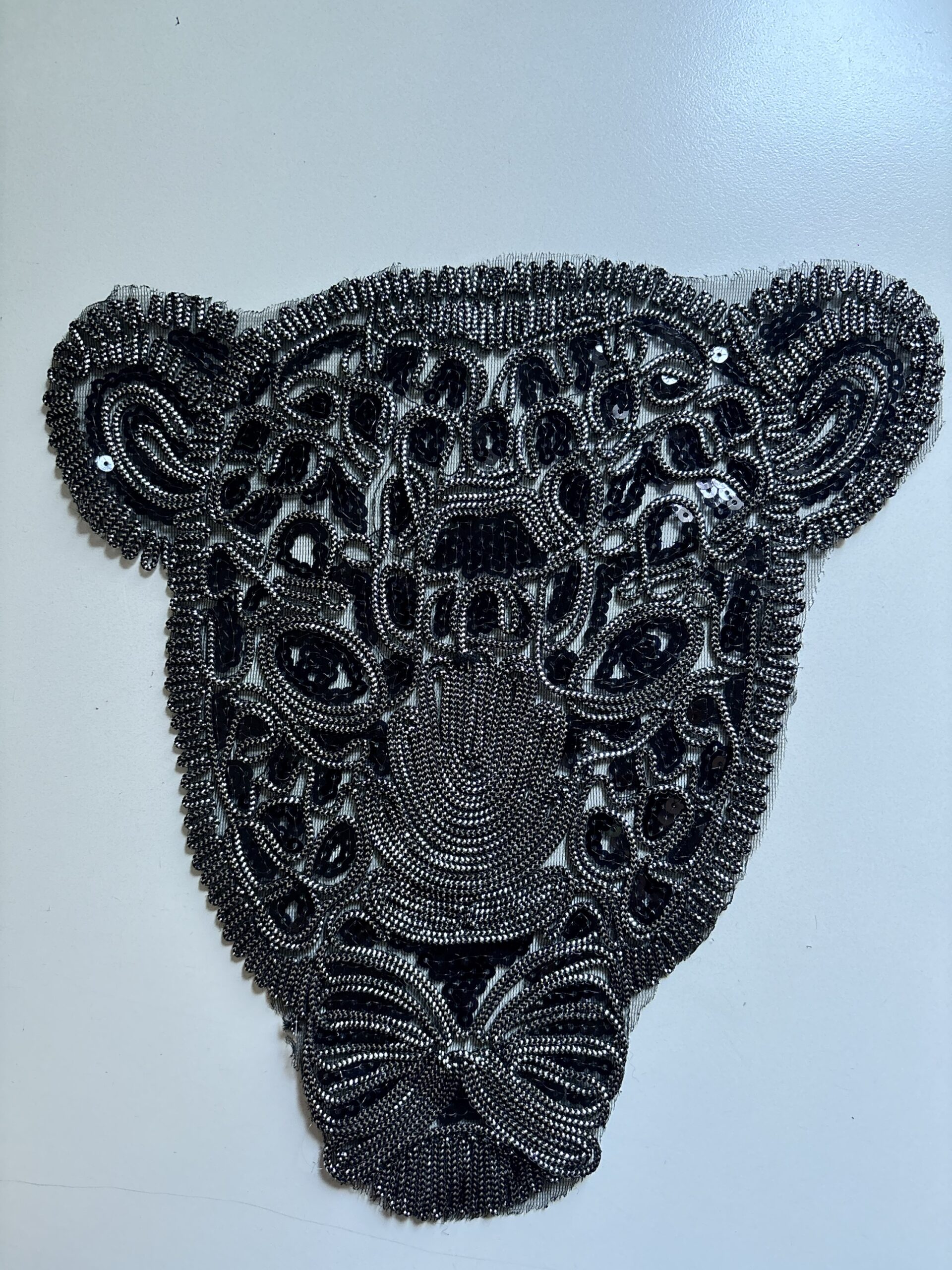 Aplique bordado en tul con hilos plateados y lentejuelas negras.