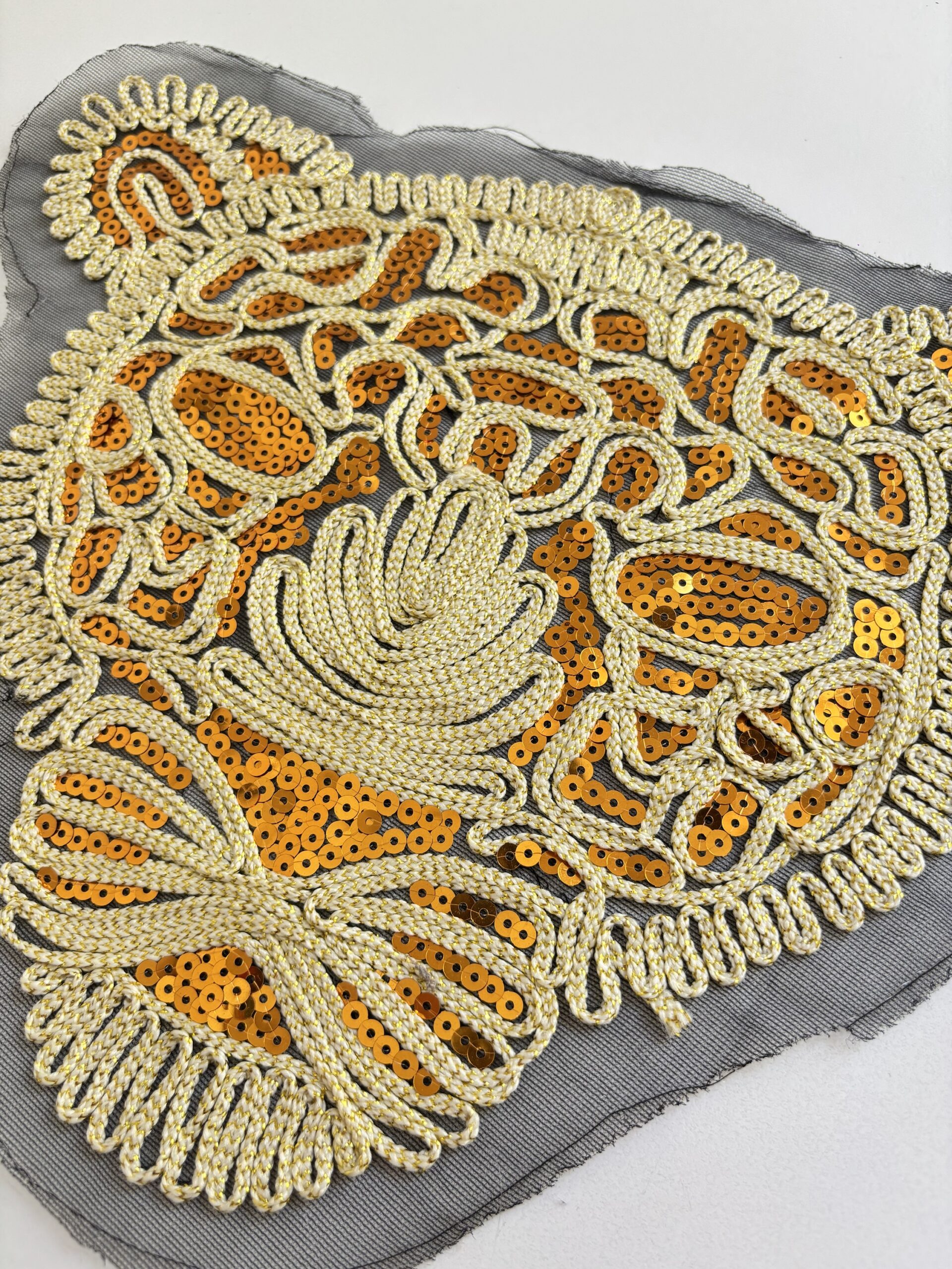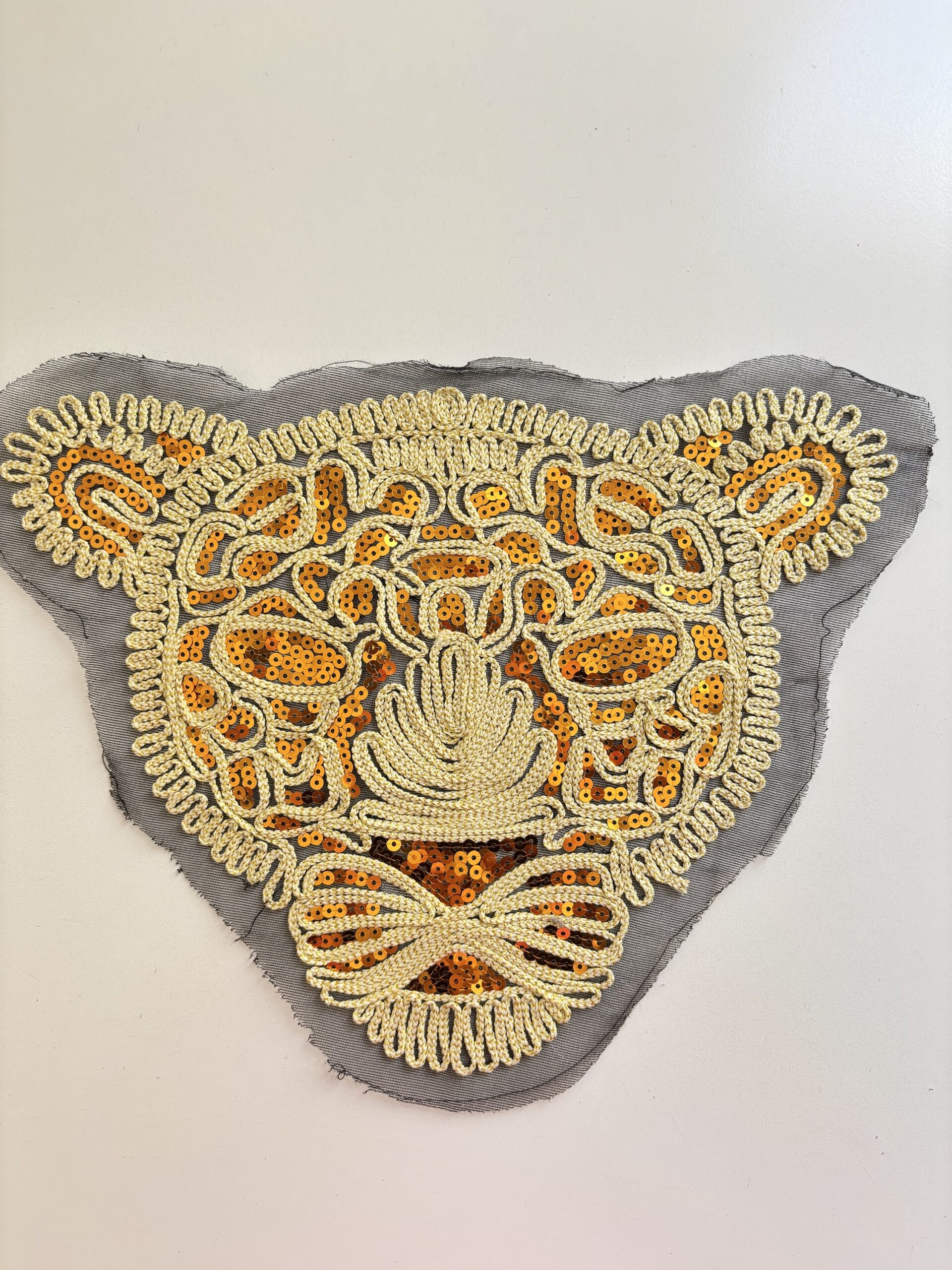 Aplique bordado en tul con hilos y lentejuelas doradas.