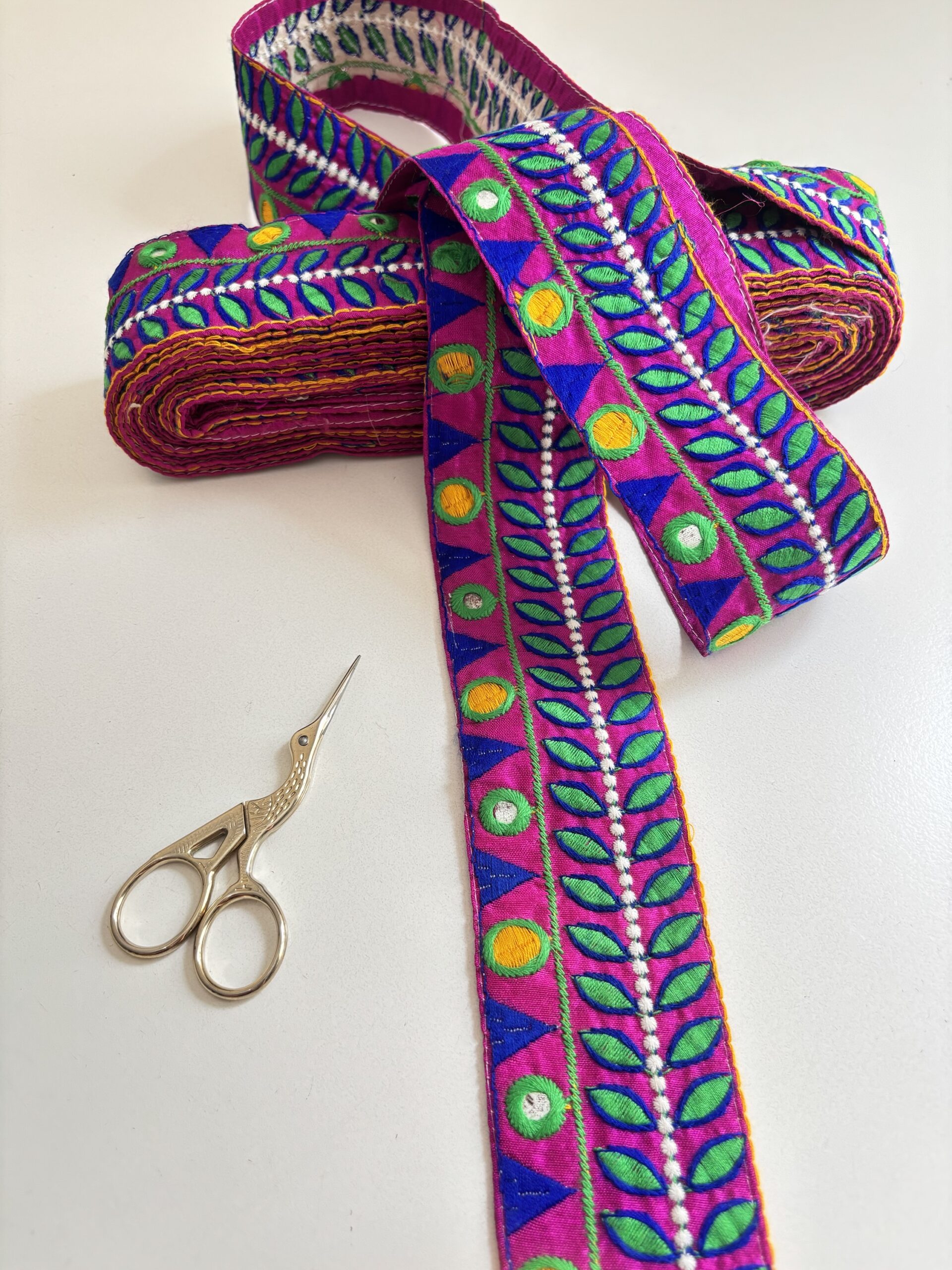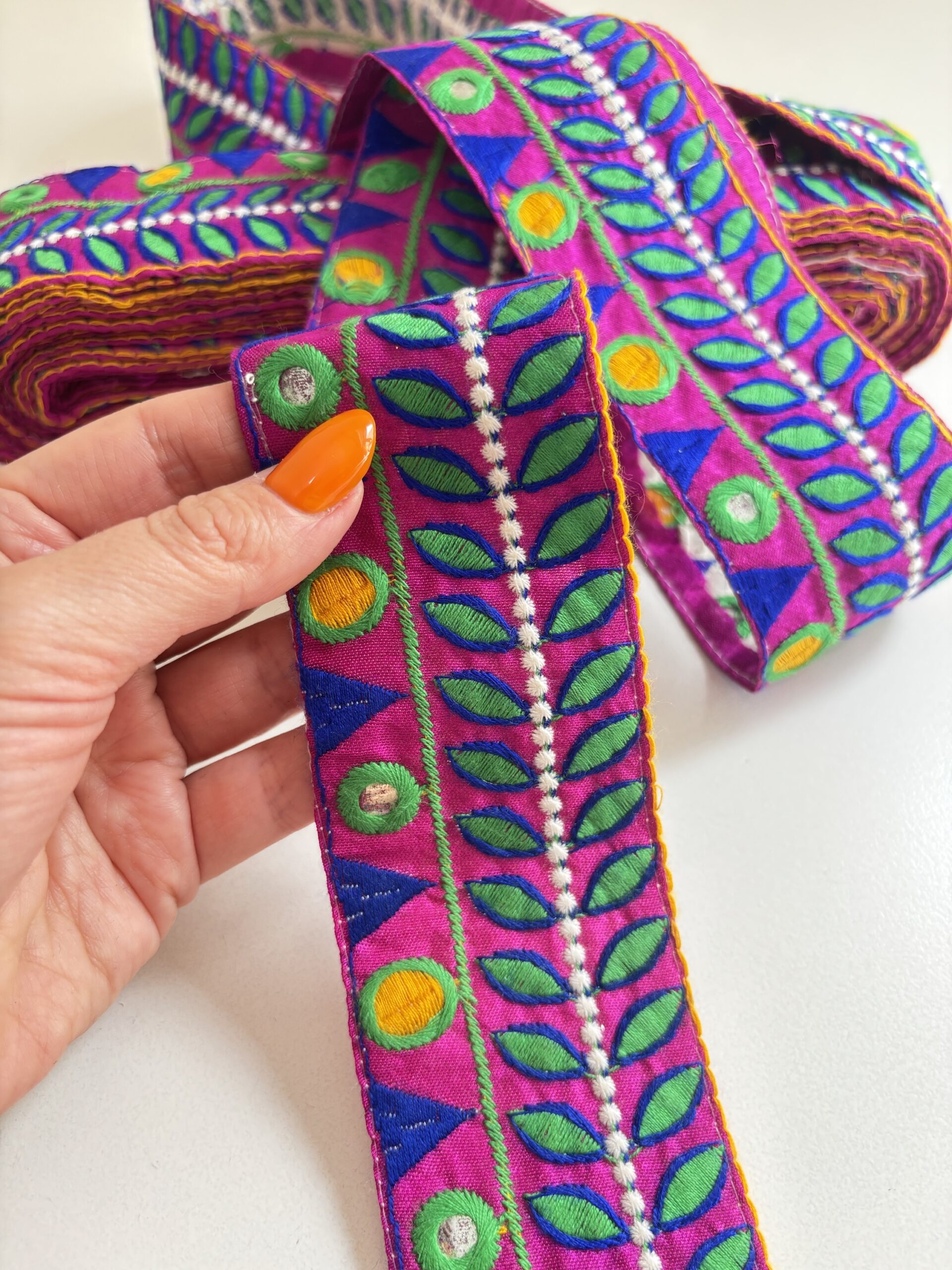 Bordado en tela violeta con hilos color verde, azul y amarillo, también tiene algunos espejitos 🤩