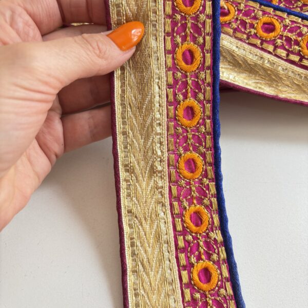 Divino galón dorado y fucsia, bordado con hilos dorados y amarillos. En las fotos te muestro como lo usé yo, lo dividí en 2, una parte la puse en el costado del pantalón y la otra en el ruedo para alargarlo unos centímetros 🤩 Medida 5 cm de ancho. El precio es x metro.